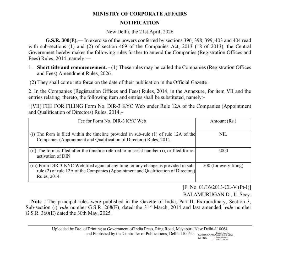 The Ministry of Corporate Affairs (MCA) has issued Notification G.S.R. 300(E) dated 21 April 2026, amending the Companies (Registration Offices and Fees) Rules, 2014 with respect to DIR-3 KYC Web filings.