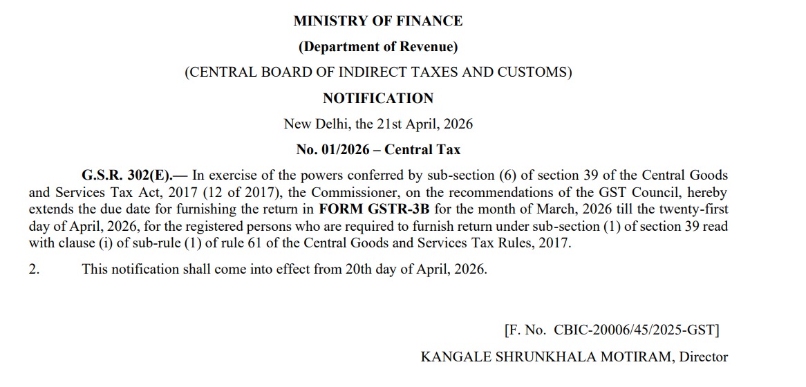 The CBIC has extended the due date for filing GSTR-3B for March 2026 to 21st April 2026.